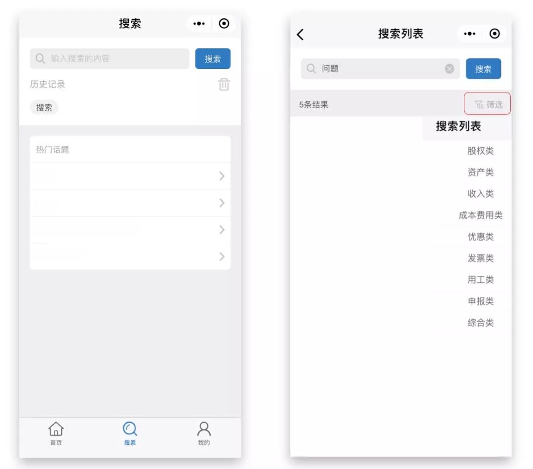 🔸搜索页面可搜索你感兴趣的问题并可通过问题类别筛选您想要的内容。