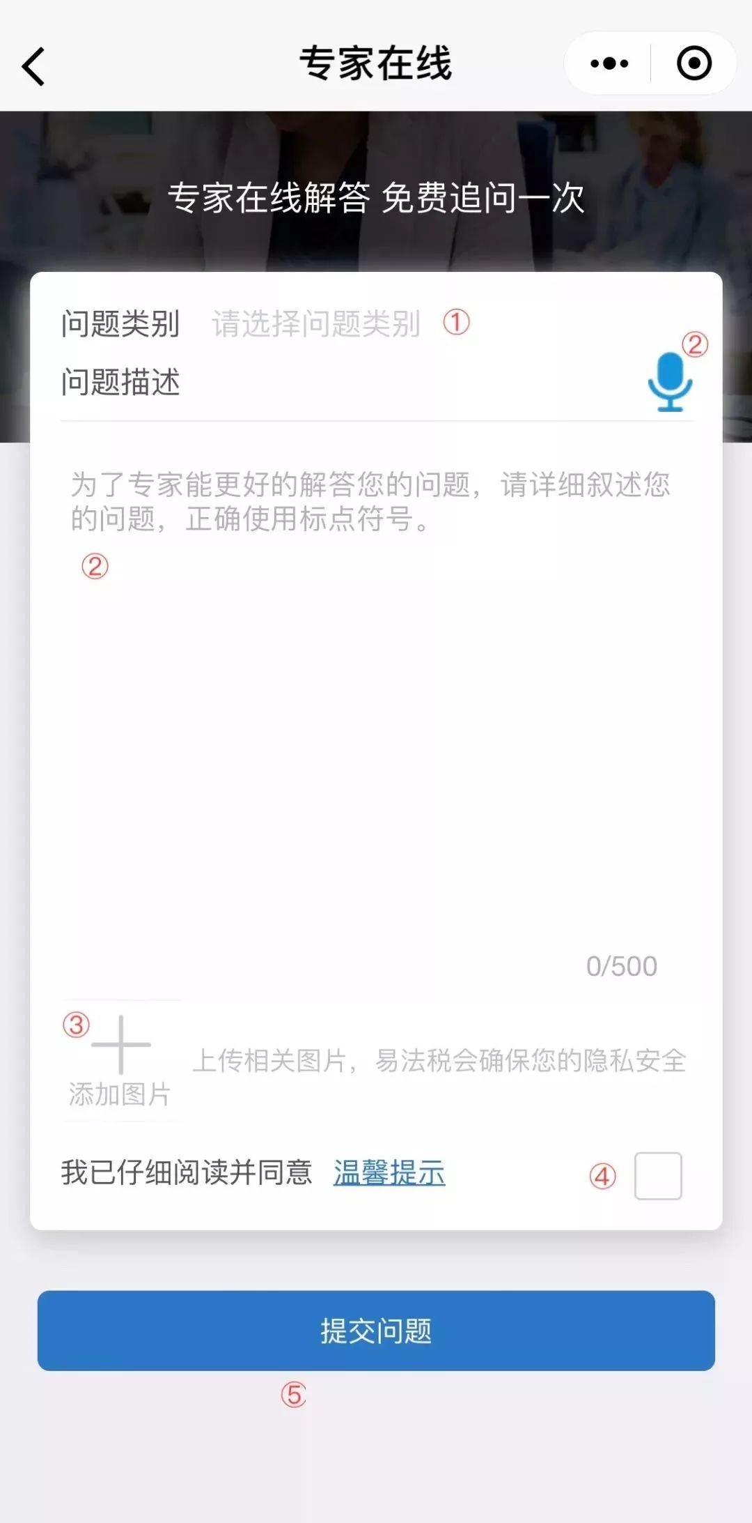 ② 描述您的问题(可文字或语音,文字不能多于500个字符,语音限一分钟内,二者只可选一)