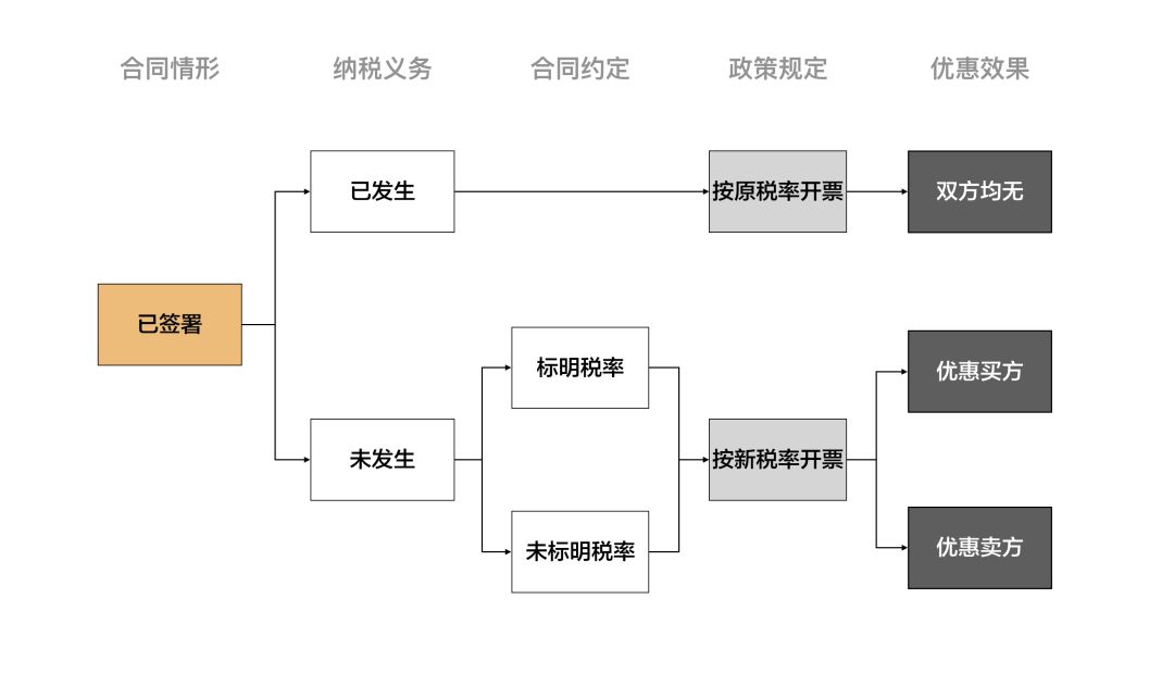 以买卖交易为例,对已经签署未履约完成的买卖合同,若增值税纳税义务已发生,只能按原税率开具增值税发票,此时,买卖双方无法享受此次降税优惠;若纳税义务未发生,又分两种情形,一种是合同中写明税率的情形,此时,卖方按降税优惠税率开具增值税发票,税率下降部分应返还给买方,因此买方享受到了税率下降的优惠;一种是合同中未写明税率的情形,此时,卖方按降税优惠政策开具增值税发票,由于双方并未约定税率的多少,因此卖方享受到了税率下降的优惠。(如下图)