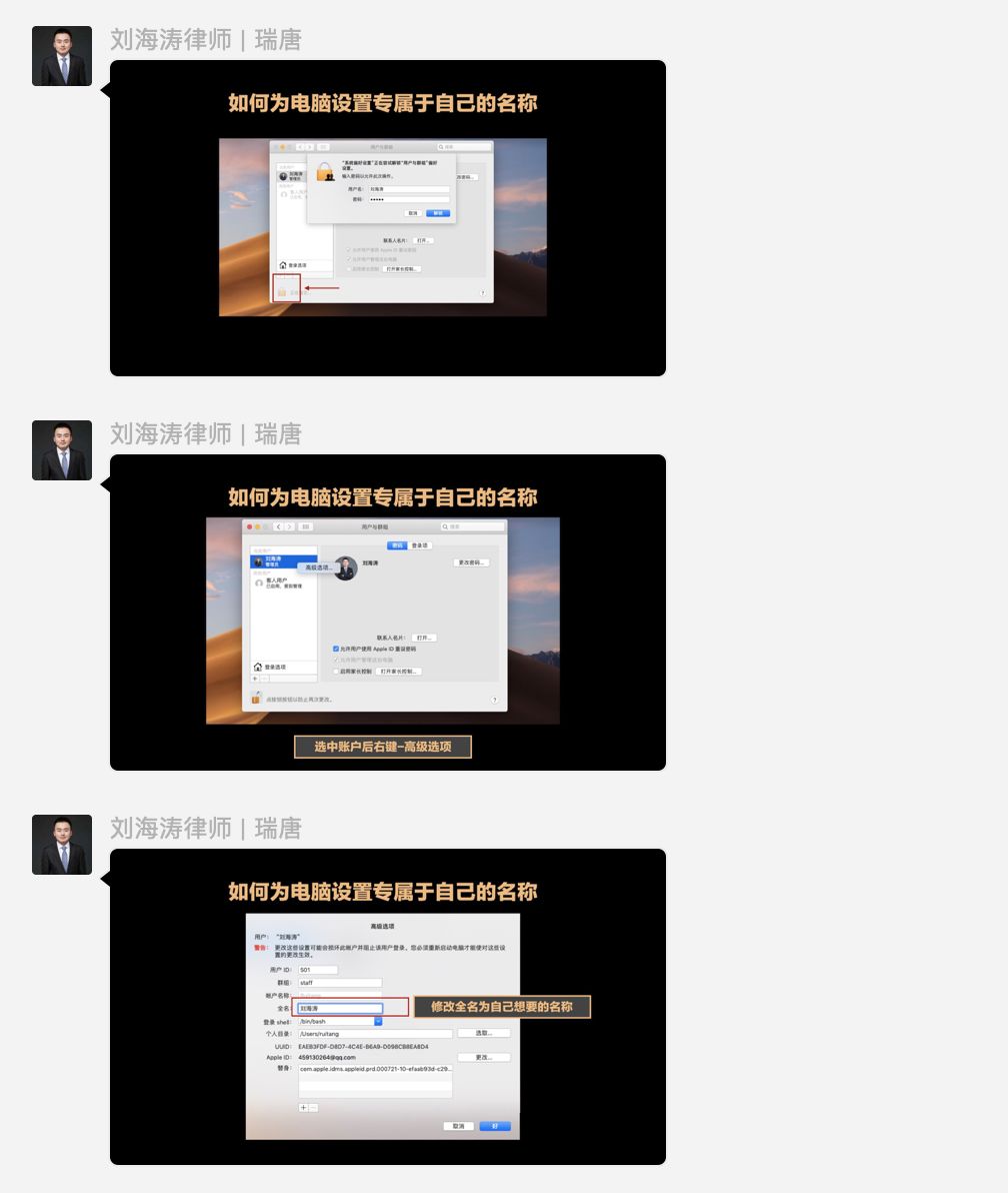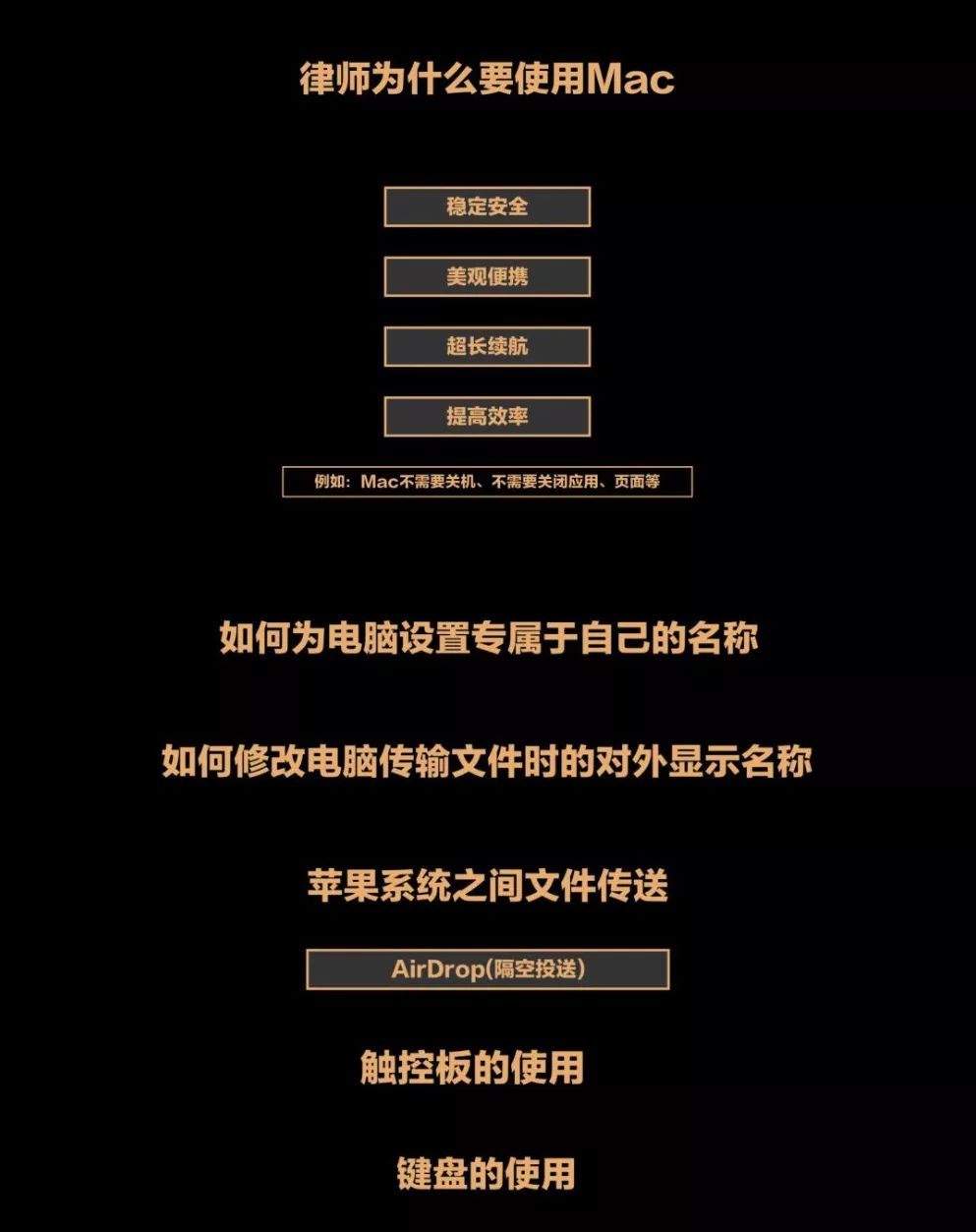 首次课程主要讲述了律师为什么要选择使用mac电脑、如何为自己的mac电脑设置专属名称、如何修改电脑传输文件时的对外显示名称、苹果系统之间的文件传输、触控板及键盘的使用这几个基础的mac电脑操作。
