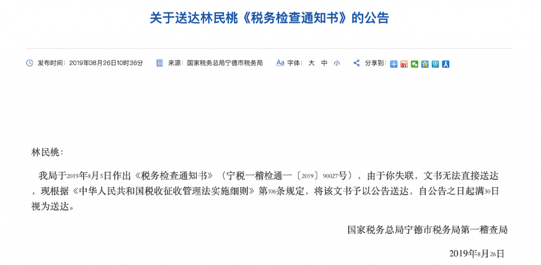 4月30日,国家税务总局福建省税务局官网发布一条宁德市税务局第一稽查局于2021年3月30日公示的《关于送达林民桃<税务事项通知书>的公告》的送达信息,引起很多财税界人士转发热议。