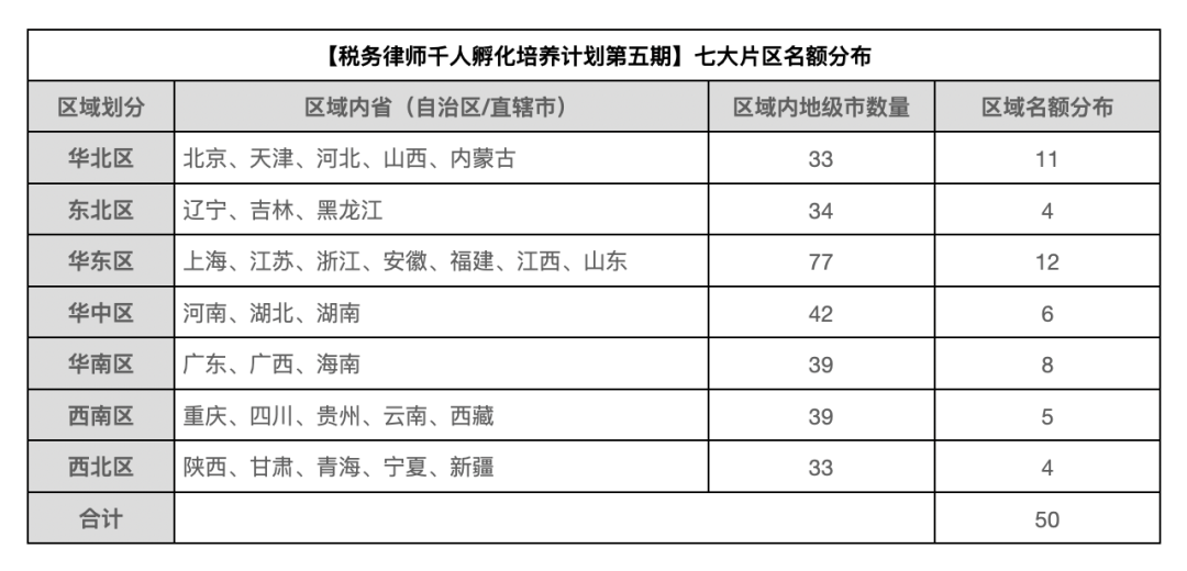 税盟计划在全国范围内孵化培养1000名律师转型成为税务律师,每期招募50名律师,名额分布采取“区域限额,城市不限”的原则,按照华北、东北、华东、华中、华南、西南、西北七个区域进行分配,既照顾到国内不同地区律师转型税务律师的需求,也考虑各区域税收法律服务的客户广泛性和发展均衡性。
