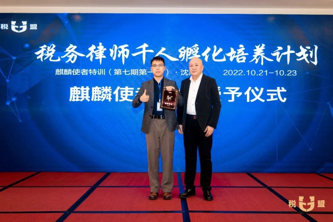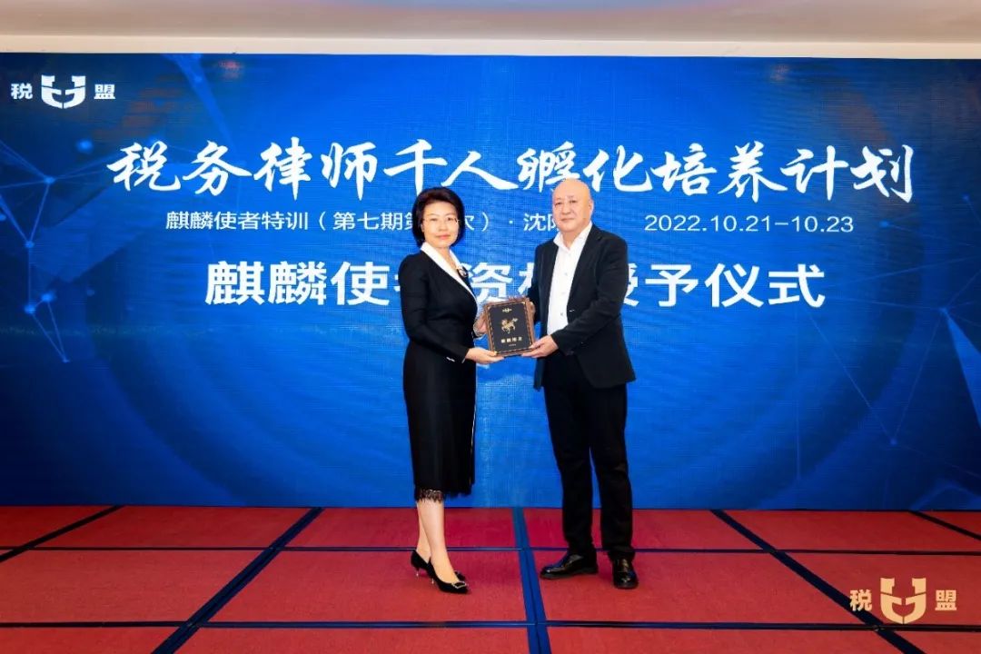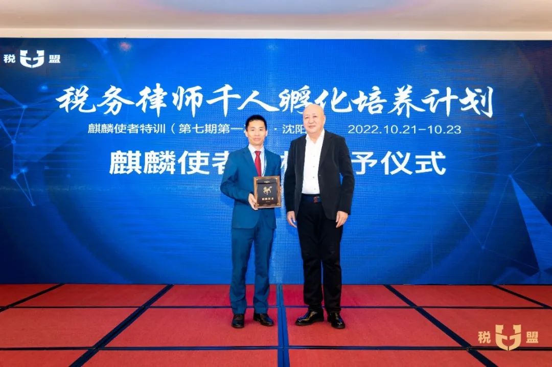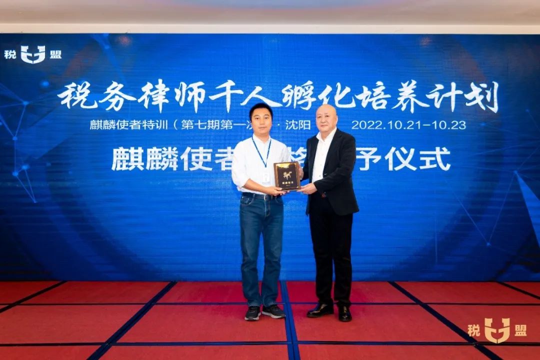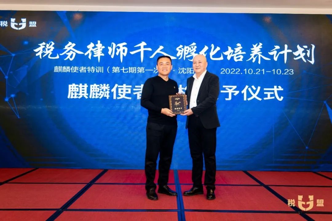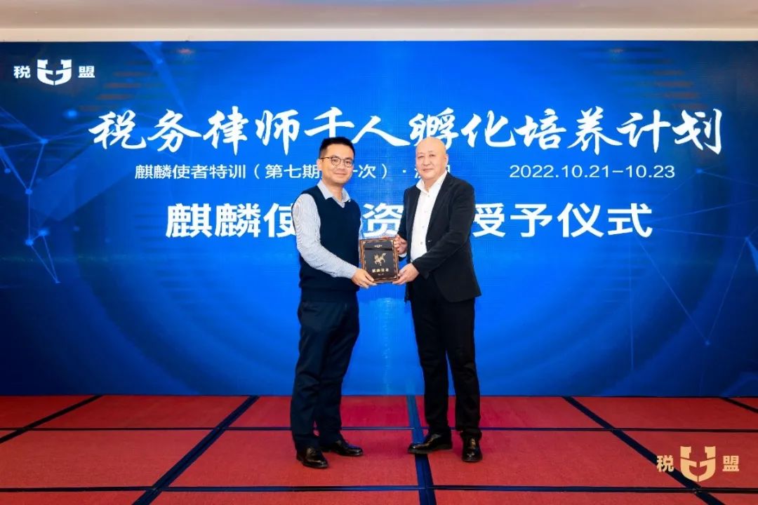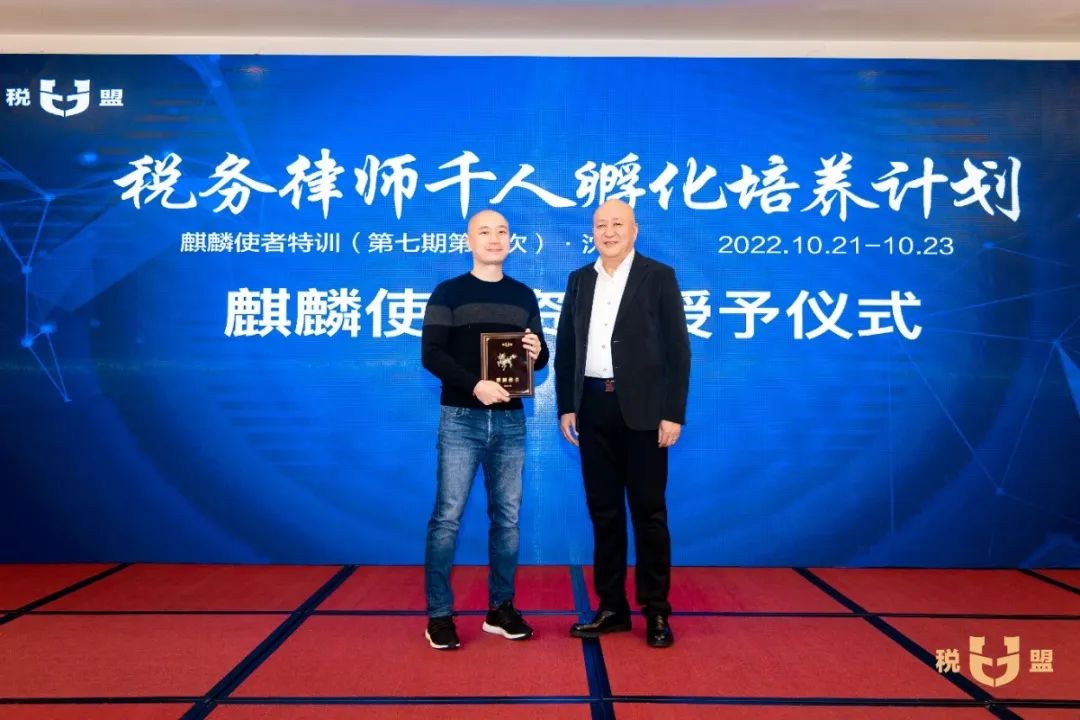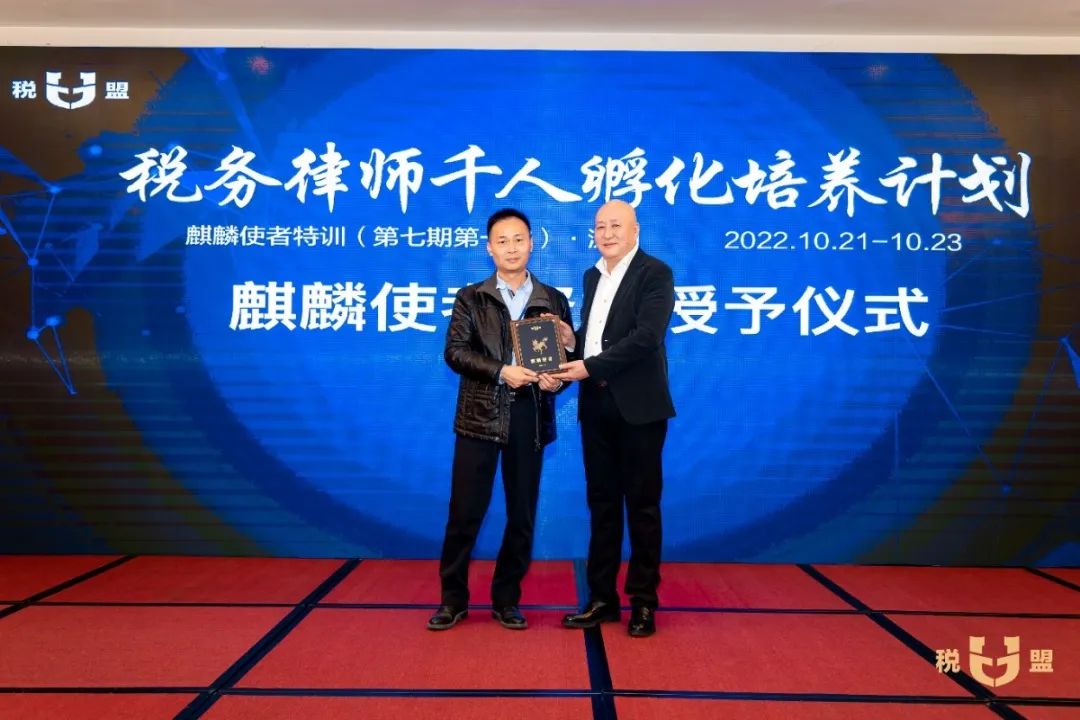 在麒麟使者资格授予仪式环节,陈春林律师为第七期麒麟使者授予了“麒麟使者”荣誉名号和专属编号,全场欢欣鼓舞,掌声不断。参加特训的观摩律师当场申请成为麒麟使者,税盟通过申请,并为他进行了资格授予。