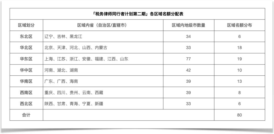 “税务律师同行者计划”第二期开放80席名额,各区域名额分配详见下图: