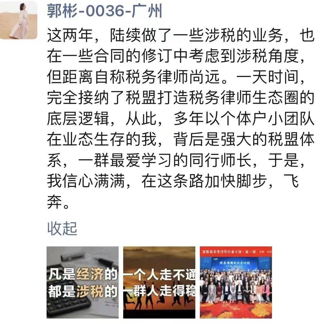 可喜的是,在税盟科学系统培养下,一些同行者已经开始为客户解答涉税咨询,洽谈涉税法律服务项目,扩大了法律服务业务,增强了行业竞争实力,对常法赋能成效倍增。他们的成长,印证了税盟培养实力的强大。