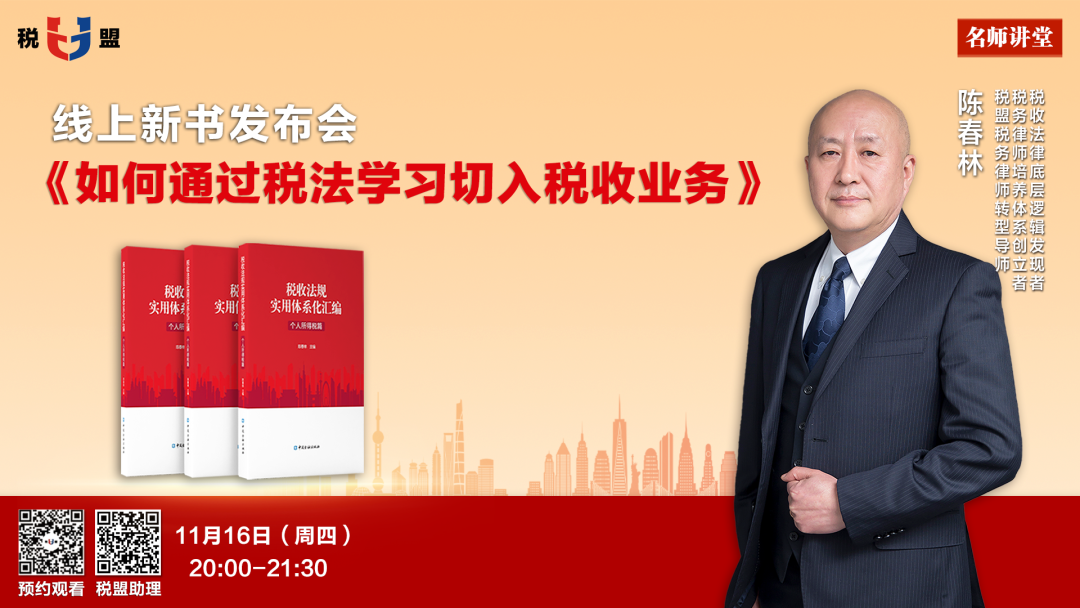 2023年11月16日20点,锁定税盟直播间。让我们共同期待陈春林导师的精彩课程,一同见证《税收法规实用体系化汇编》系列丛书的荣耀发布,我们不见不散。