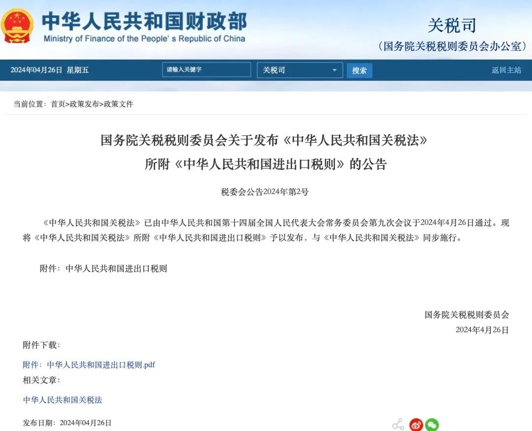 关税税率依照前四款规定调整的,由国务院关税税则委员会发布。