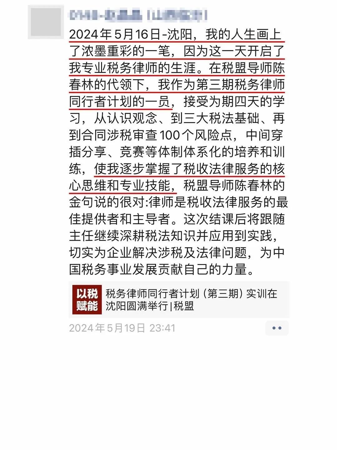近日,税务律师同行者计划第三期实训圆满落幕,再次获得了参课律师的高度认可和广泛赞誉。参课律师对税收法律服务的热情与执着,也体现了他们在专业领域中的持续进步和成长。
