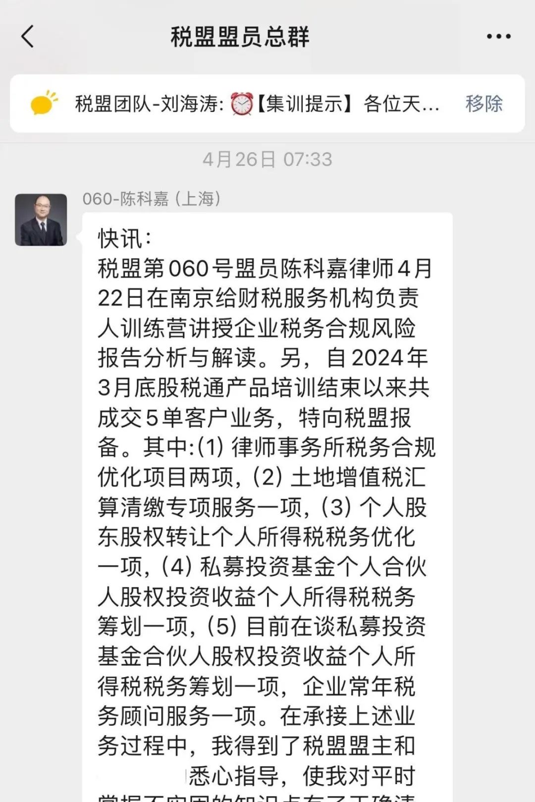 现在的我拥有了高效处理各类案件的能力,有的案子没有见面仅是通过网络或电话的方式沟通就签了单,有些案件甚至在还未与当事人见面的情况下便完成了谈判,同时收到了服务费用,这不仅是客户对我专业能力的极大认可,更是对税盟培养成果的充分肯定。