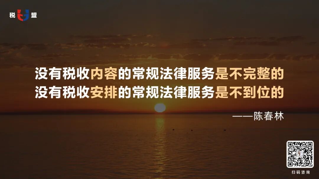 越来越多的律师和企业老板开始意识到,税法也是法律,律师应该懂税。“没有税收内容的法律服务是不完整的,没有税收安排的法律服务是不到位的”